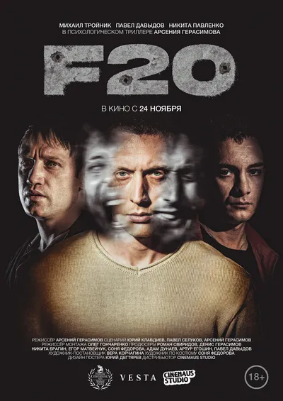 Фильм F20 (2022) — Криминал, Триллер. Режиссёр: Арсений Герасимов. В главных ролях: Павел Давыдов, Михаил Тройник, Никита Павленко. Хронометраж — 1 ч 28 мин.
